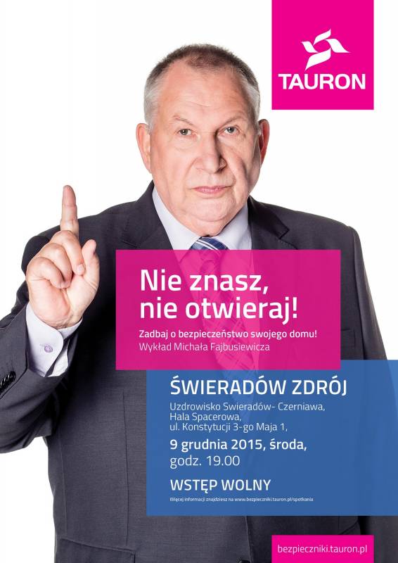 już w środę 9 grudnia 2015 r. o godz. 19:00 w Uzdrowisku Świeradów - Czerniawa odbędzie się bezpłatne spotkanie edukacyjne na temat bezpieczeństwa z udziałem redaktora Michała Fajbusiewicza. Do udziału w wydarzeniu zaproszeni są wszyscy seniorzy, ich bliscy oraz opiekunowie, którym zależy na poprawie bezpieczeństwa osób starszych. Wstęp wolny.