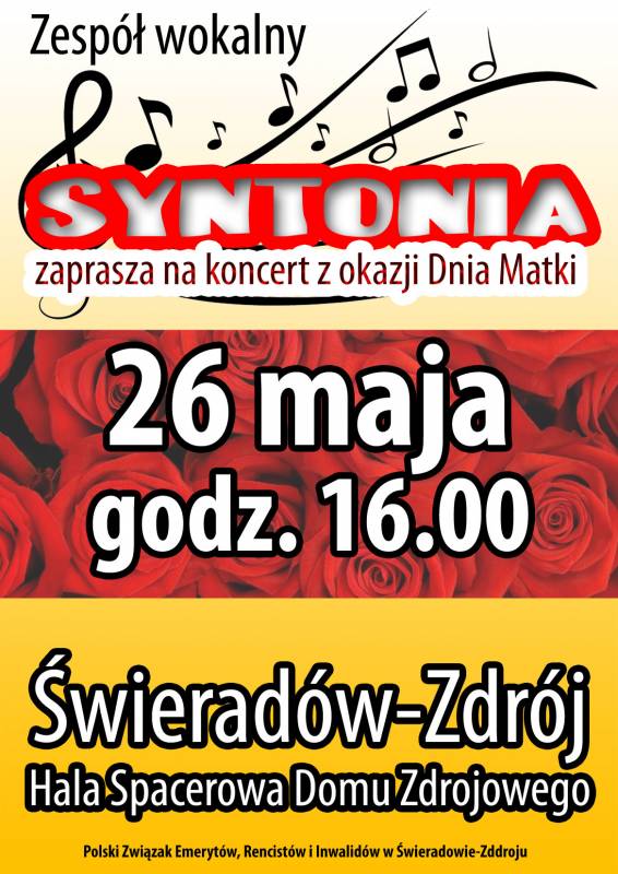 Serdecznie zapraszamy wszystkich Państwa na Koncert z okazji DNIA MATKI - 26 maja br. na godz. 16.00 w Hali Spacerowej Domu Zdrojowego, wstęp wolny
