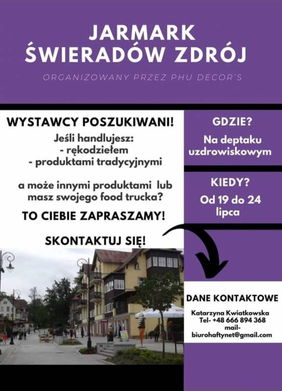jarmark, który miał się odbyć w Świeradowie-Zdroju w dniach 19-24 lipca br., z przyczyn od nas niezależnych, decyzją organizatora FHU DECOR's został ODWOŁANY!