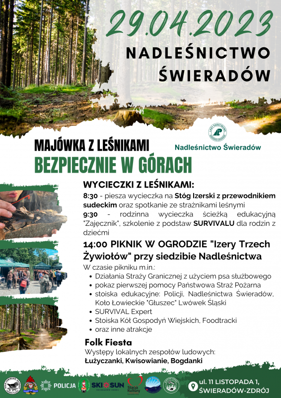Jak co roku majówkę dzielimy na dwie części, w pierwszej od rana ruszają wycieczki z leśnikami do lasu, gdzie oprócz walorów krajobrazowych dodajemy edukację oraz pokazy w terenie. Pierwsza propozycja to wyjście na Stóg Izerski z przewodnikiem sudeckim i leśnikami. Na szczycie na uczestników wycieczki będzie czekać straż leśna z pokazem i prelekcją nt. bezpieczeństw w lesie. Druga wycieczka rusza z leśnikami na ścieżkę edukacyjną „Zajęcznik” gdzie na szczycie będzie czekać szkoleniowiec z firmy Survival Expert ze szkoleniem z podstaw bezpiecznego survivalu dla rodzin z dziećmi.