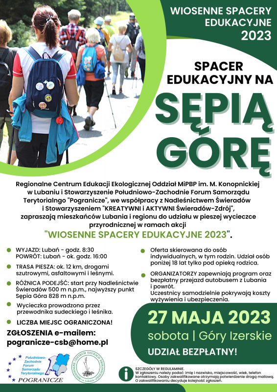 Regionalne Centrum Edukacji Ekologicznej Oddział MiPBP im. M. Konopnickiej w Lubaniu i Stowarzyszenie Południowo-Zachodnie Forum Samorządu Terytorialnego "Pogranicze" w Lubaniu, we współpracy z Nadleśnictwo Świeradów i Stowarzyszeniem "Kreatywni i Aktywni Świeradów-Zdrój", zapraszają mieszkańców Lubania i regionu do udziału w pieszej wycieczce przyrodniczej "Spacer edukacyjny na Sępią Górę" w ramach akcji "WIOSENNE SPACERY EDUKACYJNE 2023". Udział bezpłatny!
