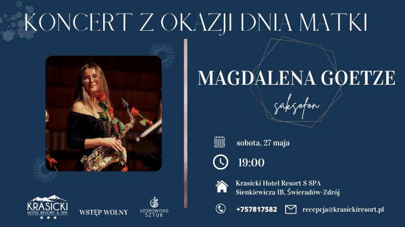 Hotel Krasicki Resort & Spa oraz Stowarzyszenie "Uzdrowisko Sztuk" zapraszają wszystkich na piękny koncert z okazji Dnia Matki, który odbędzie się dzień później, czyli 27 maja w Restauracji Hotelu Krasicki.