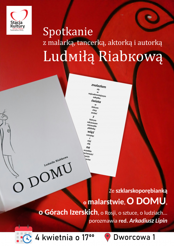 Serdecznie zapraszamy na spotkanie z Ludmiłą Riabkową - pisarką, malarką, tancerką i aktorką ze Szklarskiej Poręby. Rozmowę z artystką o jej książce "O domu" poprowadzi red. Arkadiusz Lipin z Magazynu Góry Izerskie. Do zobaczenia w czwartek 4 kwietnia 2024 o godz. 17:00 w sali widowiskowej Stacji Kultury.