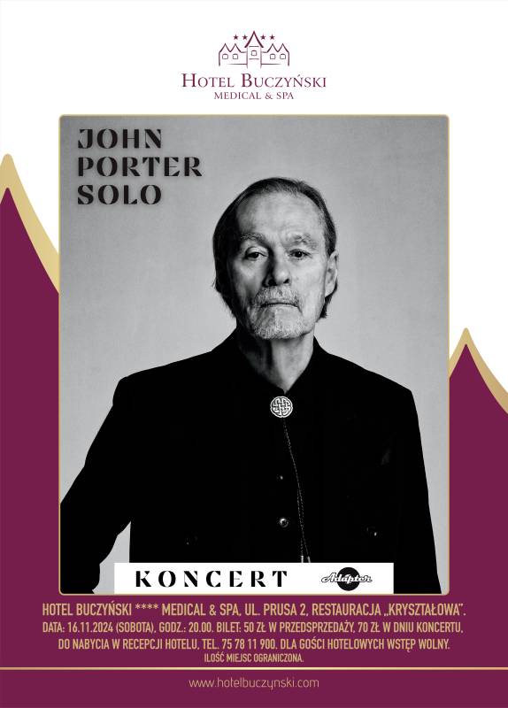 BILETY: 50 zł/osoba w przedsprzedaży, 70 zł/os w dniu koncertu (do nabycia w recepcji hotelu Tel: +48 757811900, E-mail: recepcja@hotelbuczynski.com)