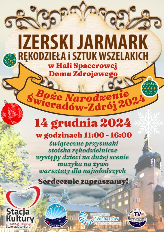 Izerski Jarmark Rękodzieła i Sztuk Wszelakich Boże Narodzenie Świeradów-Zdrój 2024 [zwany dalej Jarmarkiem] odbędzie się 14 grudnia 2024 roku na Hali Spacerowej i górnym tarasie Domu Zdrojowego w Świeradowie-Zdroju , ul. Konstytucji 3 Maja 1. Jarmark odbędzie się w godzinach: 11.00 – 16.00.