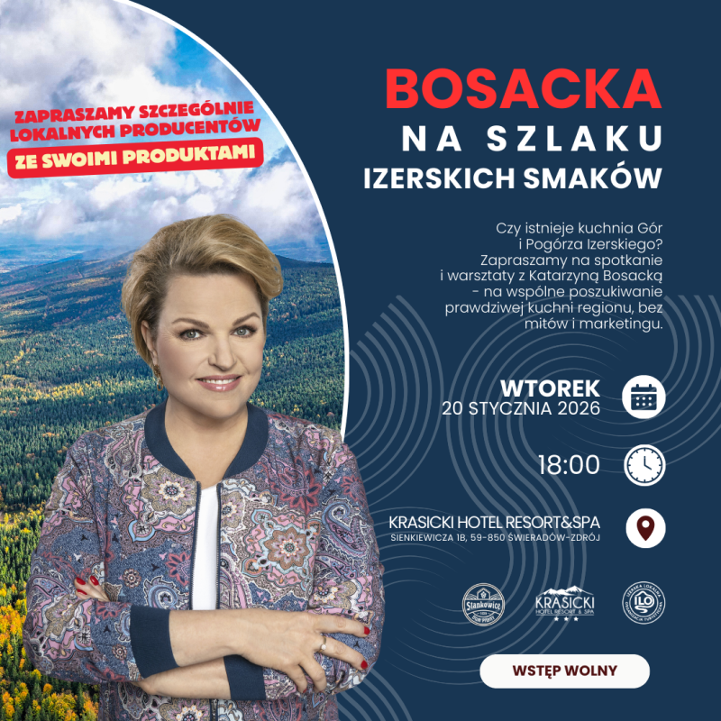 Izerska Lokalna Organizacja Turystyczna, Krasicki Hotel Resort & SPA oraz Dom Piwny Stankowice zapraszają na wyjątkowe spotkanie – kulinarną wyprawę w poszukiwaniu izerskich smaków, w której przewodniczką będzie Katarzyna Bosacka.