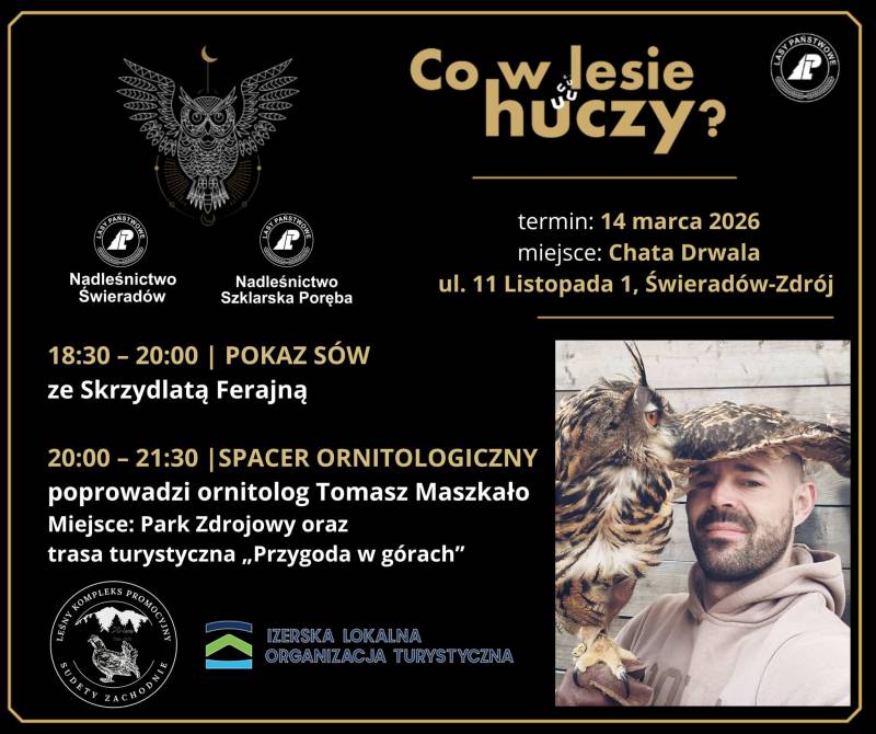 Zapraszamy na wydarzenie „Co w lesie huczy?”, organizowane w ramach Leśnego Kompleksu Promocyjnego „Sudety Zachodnie” we współpracy z Izerską Lokalną Organizacją Turystyczną. To niepowtarzalna okazja, aby z bliska poznać sowy oraz wyruszyć na wieczorny spacer z ornitologiem i odkryć, jakie ptaki można usłyszeć w nocnym lesie i parkach.