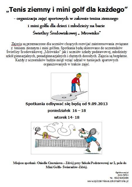 Zajecia są przeznaczone dla uczniów chcących rozwijać zainteresowania związane z tenisem ziemnym i mini golfem. Spotkania będą skierowane do uczestników Świetlicy Środowiskowej „Mrowisko” jak i uczniów szkoły podstawowej, młodzieży szkół gimnazjalnych, ponadgimnazjalnych i chętnych dorosłych. Zajęcia są bezpłatne. Każdy z uczestników będzie mógł wziąć udział w turniejach sportowych organizowanych w trakcie zajęć.