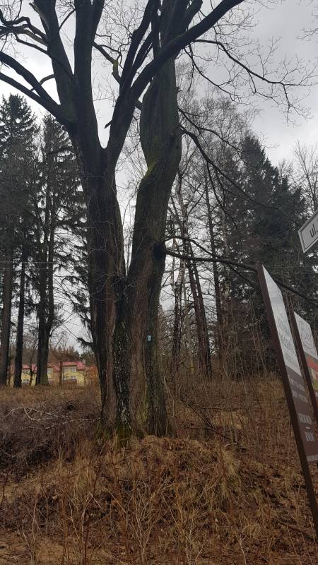 2. Dąb szypułkowy (Quercus robur L.) - położony przy ul. Bocznej 4, przy myjni – zrośnięty z bukiem pospolitym. Wiek 120-150 lat, pierśnica 383 cm. Numer rejestru: 445.