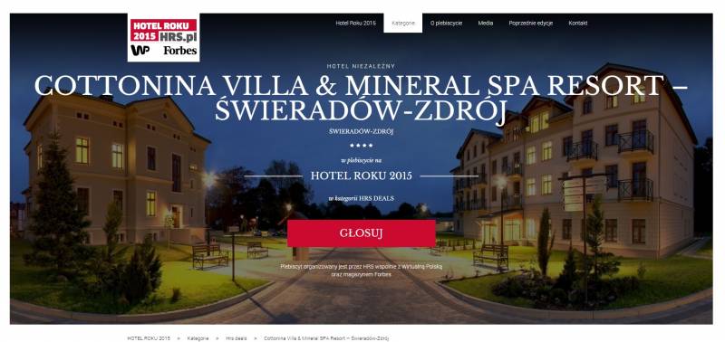 Hotel Cottonina Villa & Mineral SPA Resort nominowany w plebiscycie na HOTEL ROKU 2015