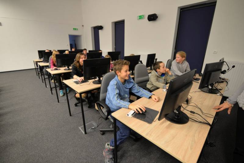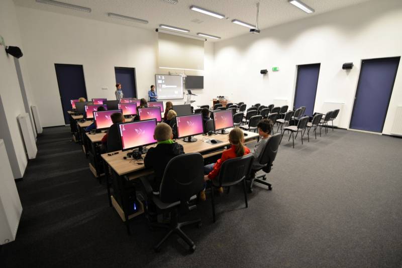 W sali komputerowej znajduje się 15 komputerów, 30 krzeseł ze stolikami, projektor oraz tablice multimedialne.