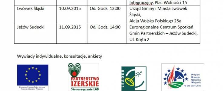 W związku z rozpoczęciem nowego okresu programowania 2014 – 2020 oraz możliwością uzyskania pomocy finansowej ze środków unijnych w ramach inicjatywy LEADER, RLKS (rozwój lokalny kierowany przez społeczność lokalną), niezbędne jest przeprowadzenie konsultacji społecznych. Stowarzyszenie LGD Partnerstwo Izerskie zaprasza do udziału w spotkaniach informacyjnych, na których zostaną zaprezentowane założenia i rodzaje działań w nowej Lokalnej Strategii Rozwoju, zostanie przygotowana analiza obszaru pod kątem zasobów, możliwości, szans, zagrożeń oraz priorytetów wsparcia.