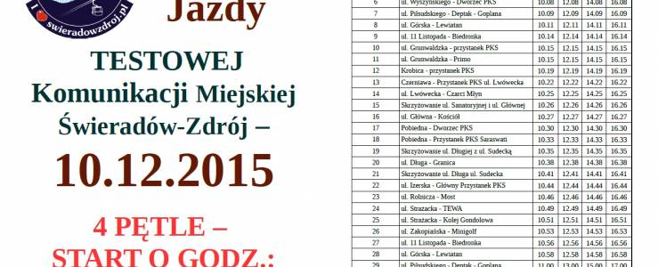 w dniu 10.12.2015 r. (czwartek), po raz drugi uruchomimy testową jazdę autobusu Komunikacji Miejskiej Świeradów-Zdrój.