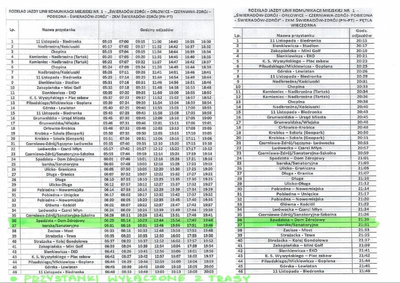 Z obsługi komunikacyjnej zostaną wyłączone podczas drugiej wizyty autobusu w ramach danej pętli dwa przystanki, tj. „Spadzista – Dom Zdrojowy” (godz. odjazdów: 06:29, 08:14, 10:29, 12:44, 15:54, 17:49, 19:44, 21:29) oraz „Izerska/Sanatoryjna” (godz. odjazdów: 06:31, 08:16, 10:31, 12:46, 15:56, 17:51, 19:46, 21:31). Po przystankach: „Główna-Kościół”, „Lwówecka-Czarci Młyn” oraz „Czerniawa-Zdrój/Sanatoryjna-Szkolna” autobus uda się bezpośrednio w kierunku Świeradowa-Zdroju, powracając na trasę na przystanku „Zacisze-Most”.
