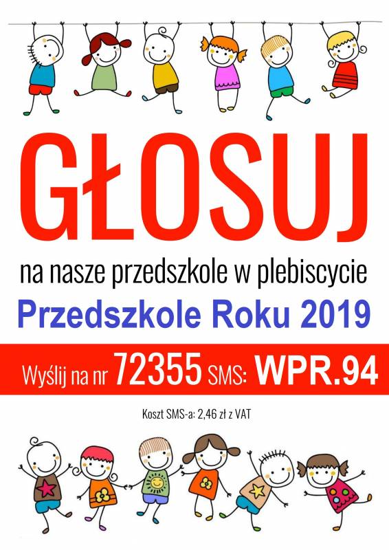 Przedszkole Miejskie można wesprzeć poprzez zagłosowanie na naszą placówkę wysyłając krótki SMS pod nr 72355 o treści: WPR.94