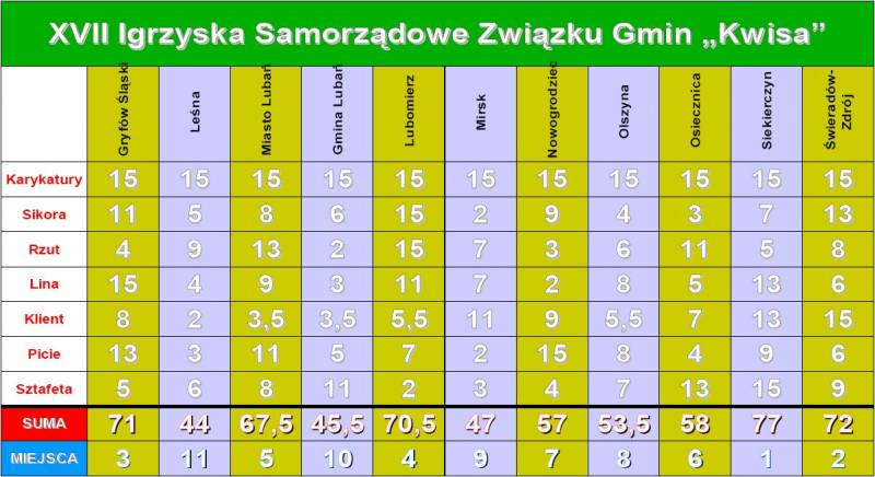 Dnia 23 maja 2009r. w Świeradowie-Zdroju odbyły się XVII Samorządowe Igrzyska Związku z Gmin Kwisa. W igrzyskach wzięło udział 11 gmin i miast z regionu: Gryfów, Leśna, Miasto Lubań, Gmina Lubań, Lubomierz, Mirsk, Nowogrodziec, Olszyna, Osiecznica, Siekierczyn, Świeradów-Zdrój. Zwyciężył Siekierczyn. Na drugim stopniu podium stanął Świeradów-Zdrój. Brązowy medal zdobył Gryfów. Igrzyska były nasycone dobrą zabawą i wspaniałą atmosferą. Wszystkim gościom serdecznie dziękujemy za udział. Zwycięzcom gratulujemy. Kolejne - osiemnaste - igrzyska odbędą się w Osiecznicy. Szczegółową tabelę wyników można obejrzeć na poniżej zamieszczonym obrazku. W naszej galerii znajduje się także fotoreportaż z igrzysk, a w dziale filmy mozna obajrzeć skrót najciekawszych wydarzeń. Serczenie zapraszamy.