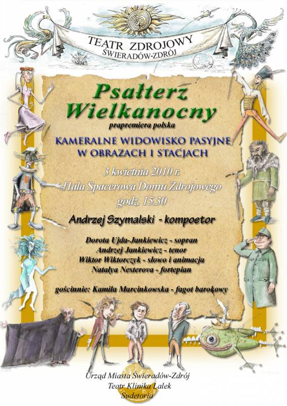 Zapraszamy wszystkich na Kameralne Widowsiko pasyjne w Obrazach i Stacjach PSAŁTERZ WIELKANOCNY (prapremiera polska), które odbędzie się 3 kwietnia 2010r. o godz. 15.30 na Hali Spacerowej Domu Zdrojowego.