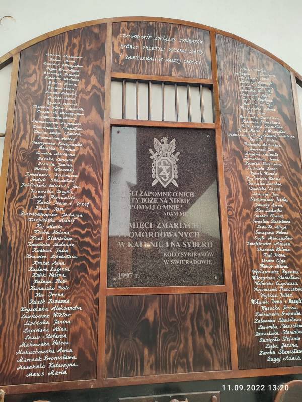 W niedzielę 11 wrzesnia o godz. 12:00 w kościele Parafia św. Józefa Oblubieńca Najświętszej Maryi Panny w Świeradowie-Zdroju uczciliśmy jak co roku Światowy Dzień Sybiraka oraz pamięć o tragicznych wydarzeniach z 17 września 1939 roku – agresji Związku Sowieckiego na Polskę. Na początku mszy św. Pani Eugenia Kudera- przewodnicząca Koła Związku Sybiraków w Świeradowie- Zdroju przywitała i podziękowała wszystkim uczestnikom uroczystości wywołując po kolei Poczty Sztandarowe, które złożyły hołd przy tablicy upamiętniającej zmarłych i pomordowanych w Katyniu i na Syberii. Były to poczty sztandarowe Ochotniczej Straży Pożarnej , Młodzieżowej Drużyny Pożarniczej , Związku Kombatantów RP i Byłych Więźniów Politycznych, Koła Związków Sybiraków, Szkoły Podstawowej Nr 1 im. Marii Skłodowskiej-Curie, Szkoły Podstawowej Nr 2 im. Jana Pawła II, byłego Gimnazjum im. Ratowników Górskich w Świeradowie-Zdroju . Następnie kwiaty złożyli przedstawiciel Urzędu Miasta w Świeradowie-Zdroju - Sekretarz Eugeniusz Grabas z przewodniczącym Rady Miasta Michałem Brutkowskim , Stacja Kultury - Serce Miasta Świeradów-Zdrój , którą reprezentowała Pani Diana Słupska z Zespół Wokalny "Syntonia" Świeradów-Zdrój - z Paniami Marianną Marek i Renatą Sroka, przewodnicząca Polski Związek Emerytów, Rencistów i Inwaliów Koło nr 6 Świeradów Zdrój Pani Irena Kojpasz, Radna powiatu Lubańskiego Pani Iwona Korzeniowska-Wojsa. Kwiaty złożyły także przedstawicielki Sybiraków z Mirska Pani Maria z córką oraz Delegacje Szkół Podstawowej nr 1 Miejski Zespół Szkół w Świeradowie-Zdroju i Szkoły Podstawowej nr 2 Świeradów-Zdrój im. Jana Pawła II . Uroczystą Mszę Świętą uświetniła homilia, którą wygłosił specjalnie zaproszony ksiądz prałat Arkadiusz Nocoń z Rzymu - profesor Papieskiego Uniwersytetu Gregoriańskiego - bliski współpracownik Papieża w kongregacji watykańskiej.