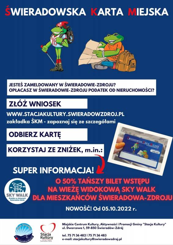 z ogromną przyjemnością informujemy, iż nowym Partnerem Świeradowskiej Karty Miejskiej (ŚKM) została nasza wieża Wieża Sky Walk - FB , która zaprasza wszystkich Mieszkańców z 50 % zniżką, za co serdecznie dziękujemy.