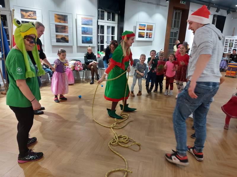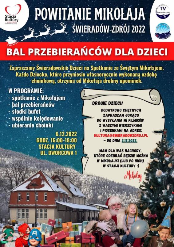 06.12.2022 późnym popołudniem w Stacji Kultury w Świeradowie-Zdroju odbył się Mikołajkowy Bal Przebierańców oraz powitanie Świętego Mikołaja. Ponad sto Dzieci wzięło udział w zabawie oraz otrzymało mikołajkowy upominek. Nie zabrakło również wspólnego ubierania choinki, ponieważ Dzieci przyniosły własnoręcznie wykonane ozdoby. Rodzice mieli okazję zrelaksować się w strefie rodzica zaaranżowanej na sali z makietą kolejową. W ufundowanym przez Stację bufecie królowały słodkości, którymi zajadali się zarówno najmłodsi, jak i ich opiekunowie - rodzice i dziadkowie.