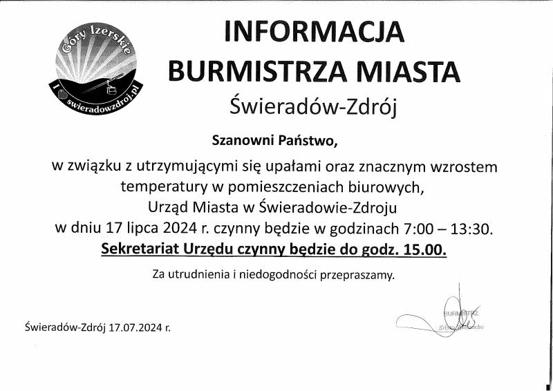 INFORMACJA O FUNKCJONOWANIU URZĘDU W DN. 17.07.2024