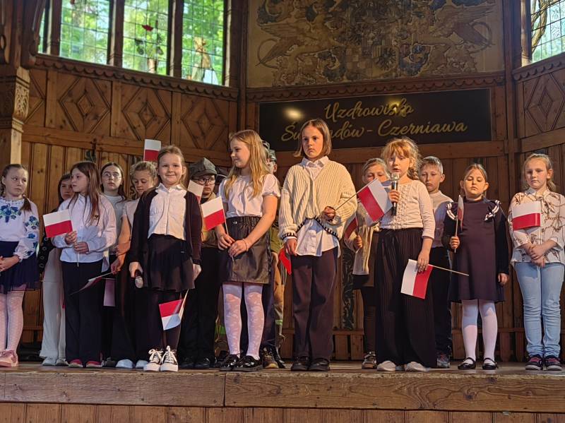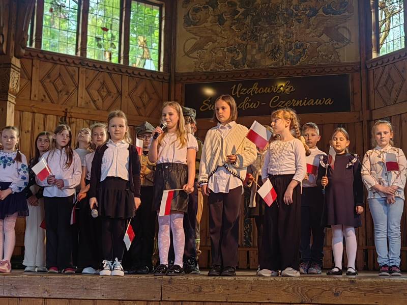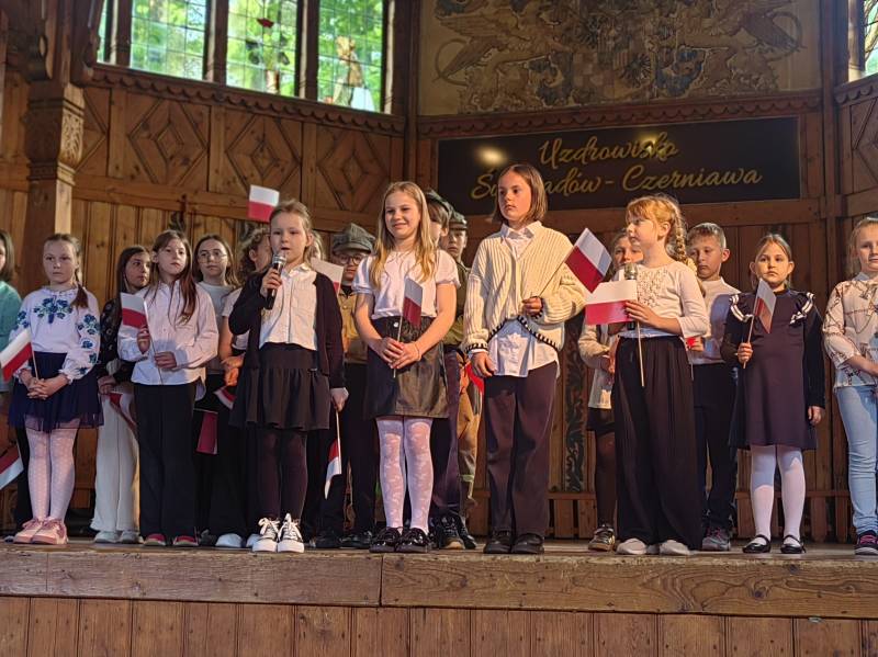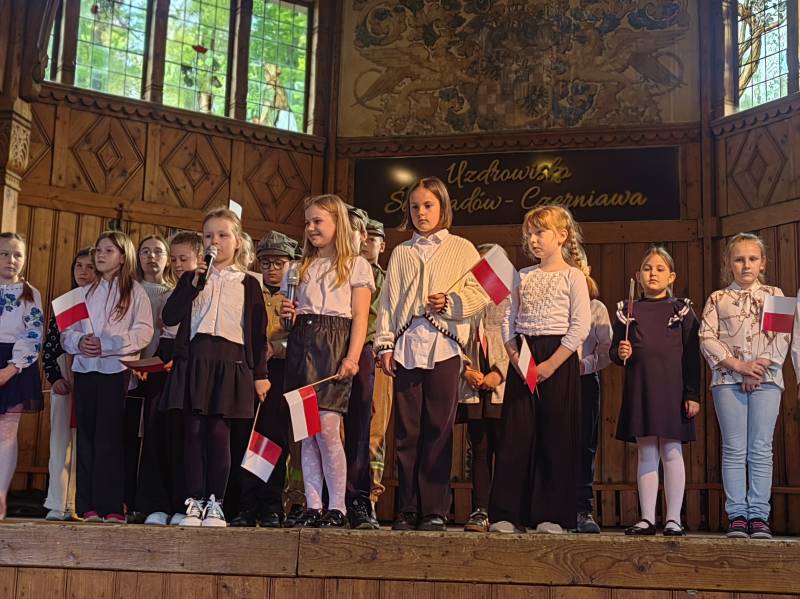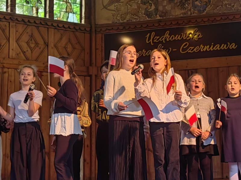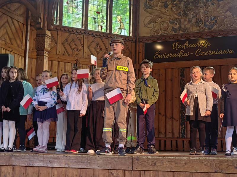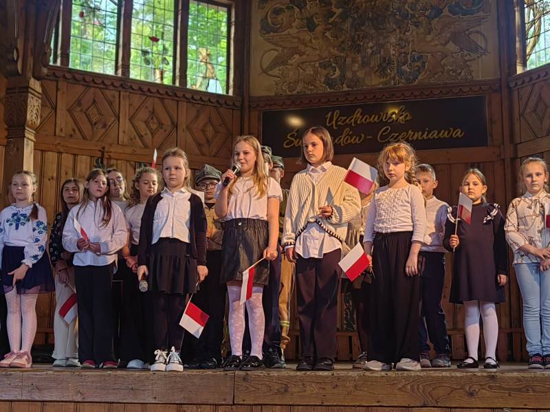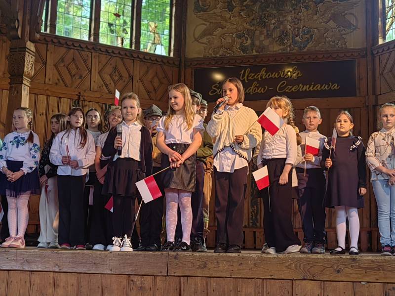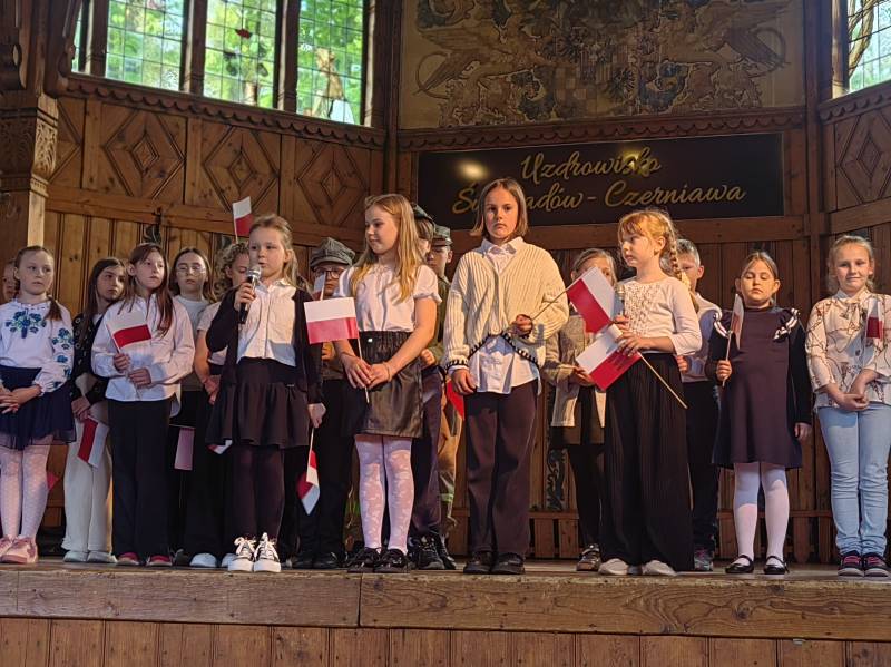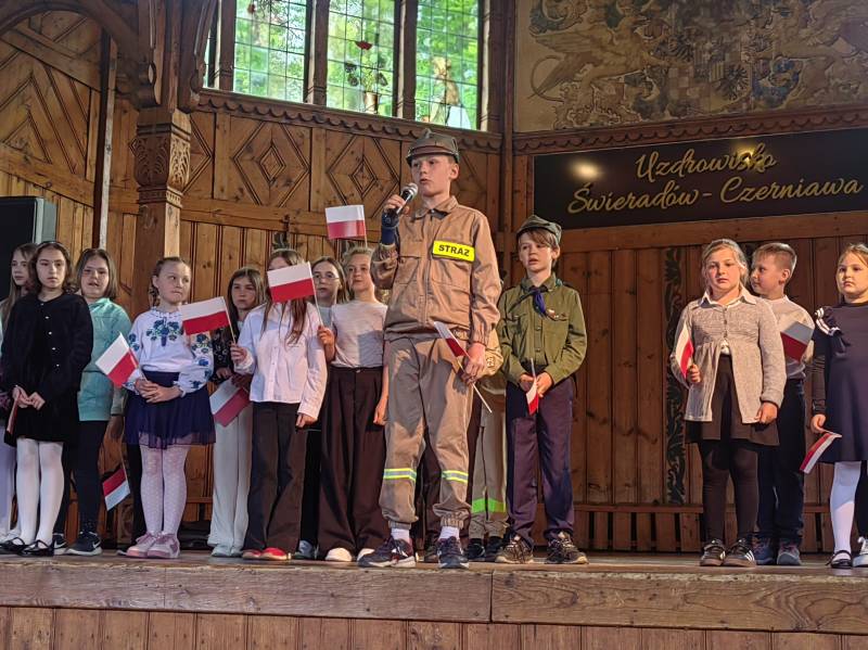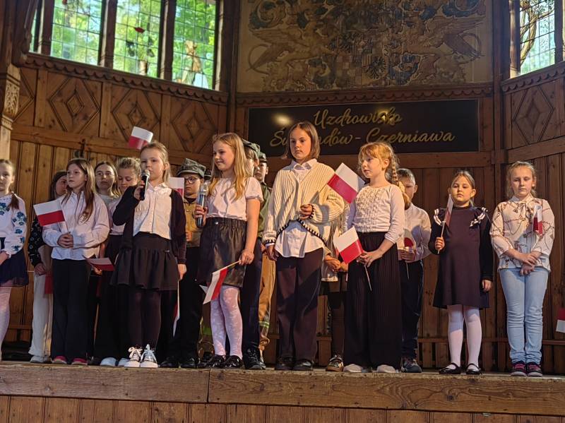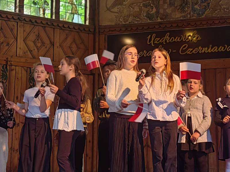 Na scenie zaprezentowały się dzieci z Miejskiego Zespołu Szkół w Świeradowie-Zdroju – klasy 2b, 3a oraz 3b, przygotowane z ogromnym zaangażowaniem przez panie: Izabelę Salawę, Ewę Mazur i Teresę Fierkowicz. Wystąpili uzdolnieni soliści, którzy wykonali patriotyczne utwory: „Rogatywka”, „Myśmy są wojsko” oraz „Jestem Polakiem”, a także recytatorzy, którzy wzbudzili podziw i wzruszenie wśród publiczności. Wojtek, Lena, Zuzanna, Łucja, Hania, Zuzia, Józef, Grzesiu, Tosia, Jagoda, Maria, Maja, Maciej, Kacper, Sei, Ignacy, Iga, Julia, Iga oraz Milana – Wasze interpretacje przypomniały nam, jak ważne jest pielęgnowanie pamięci i szacunku wobec historii – już od najmłodszych lat. Dzieci wystąpiły z ogromnym zaangażowaniem i wrażliwością – serdecznie dziękujemy wszystkim Rodzicom i Wychowawcom za ich piękne przygotowanie. Były niesamowite – mogą Państwo być z nich dumni!