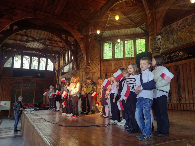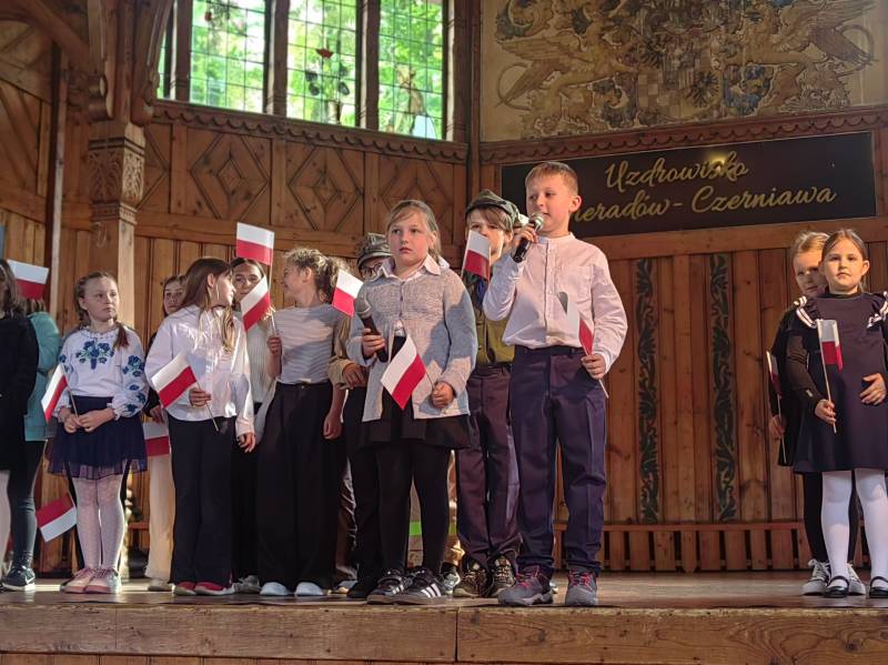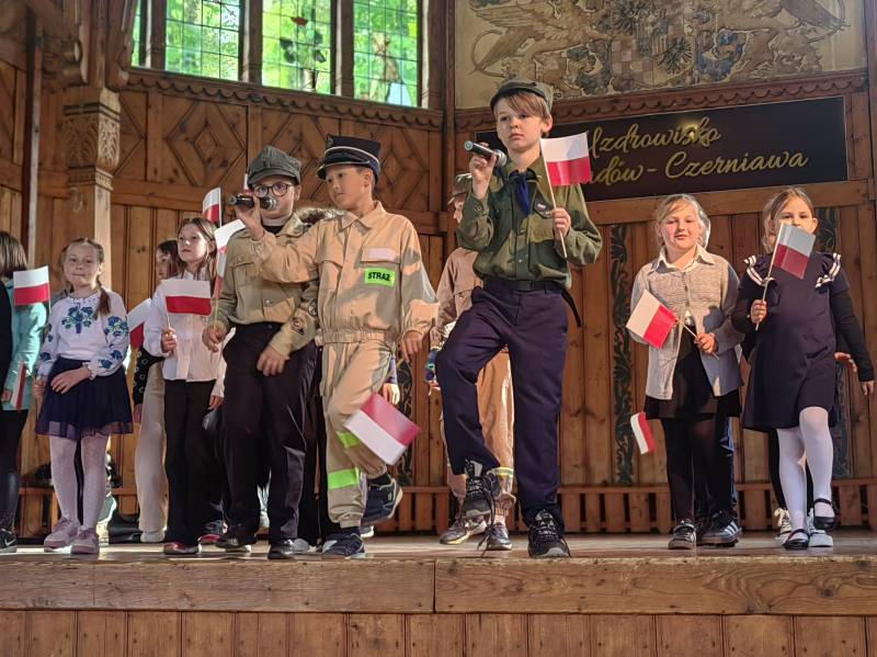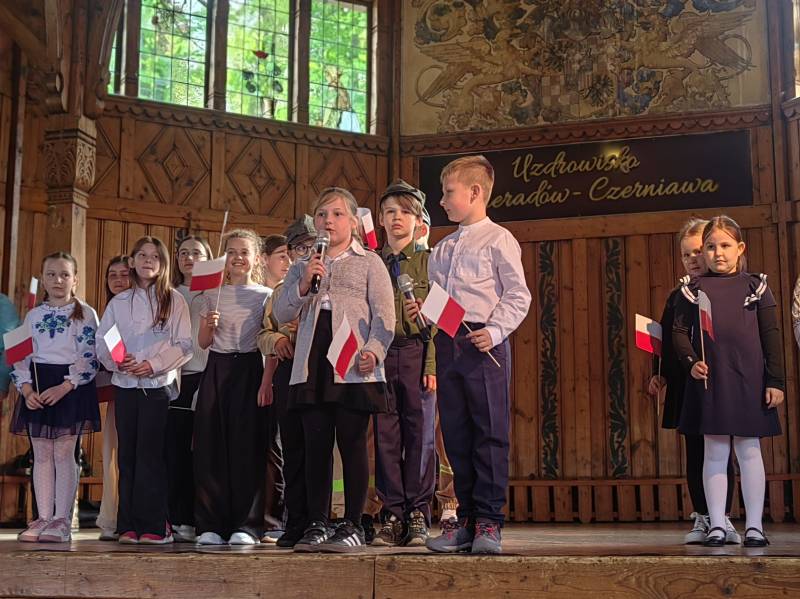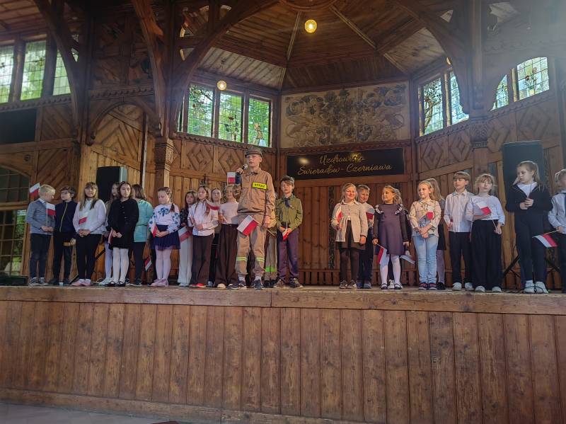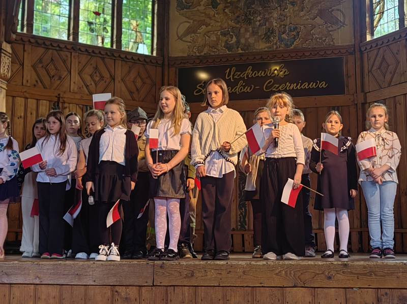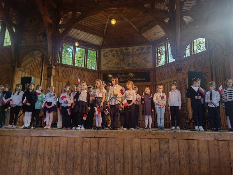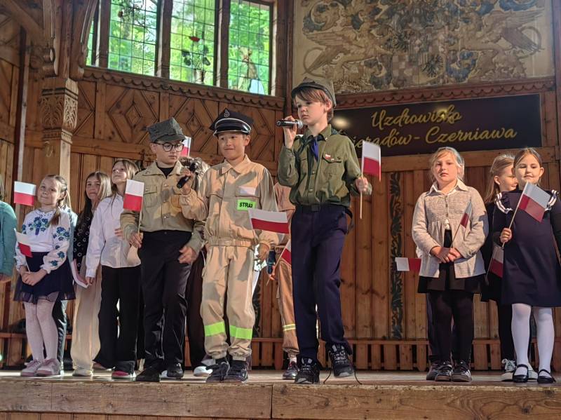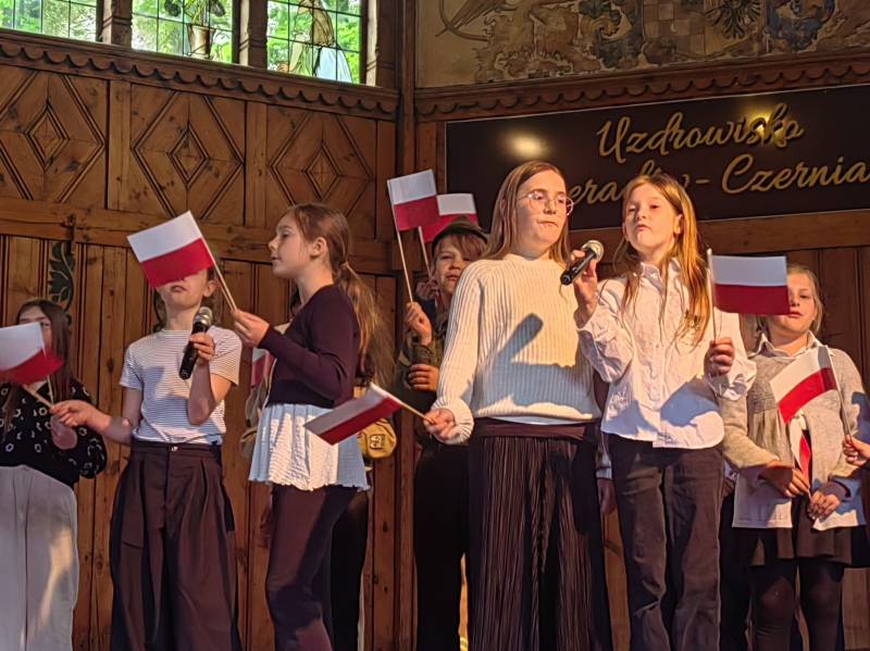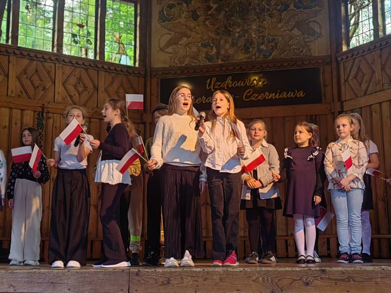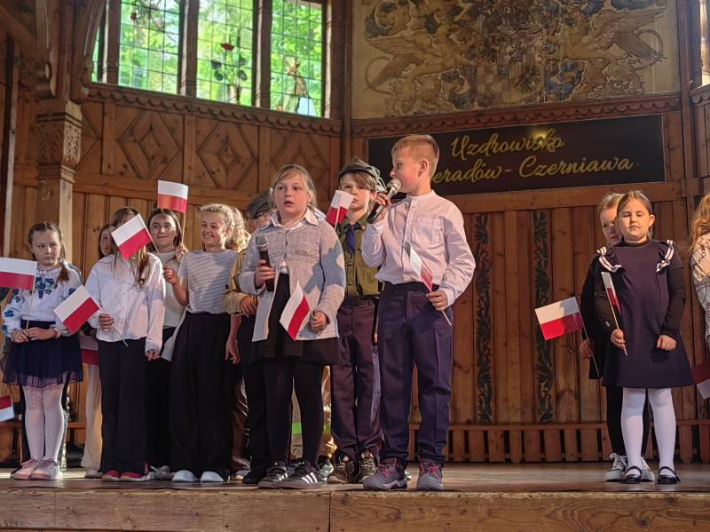 Na scenie zaprezentowały się dzieci z Miejskiego Zespołu Szkół w Świeradowie-Zdroju – klasy 2b, 3a oraz 3b, przygotowane z ogromnym zaangażowaniem przez panie: Izabelę Salawę, Ewę Mazur i Teresę Fierkowicz. Wystąpili uzdolnieni soliści, którzy wykonali patriotyczne utwory: „Rogatywka”, „Myśmy są wojsko” oraz „Jestem Polakiem”, a także recytatorzy, którzy wzbudzili podziw i wzruszenie wśród publiczności. Wojtek, Lena, Zuzanna, Łucja, Hania, Zuzia, Józef, Grzesiu, Tosia, Jagoda, Maria, Maja, Maciej, Kacper, Sei, Ignacy, Iga, Julia, Iga oraz Milana – Wasze interpretacje przypomniały nam, jak ważne jest pielęgnowanie pamięci i szacunku wobec historii – już od najmłodszych lat. Dzieci wystąpiły z ogromnym zaangażowaniem i wrażliwością – serdecznie dziękujemy wszystkim Rodzicom i Wychowawcom za ich piękne przygotowanie. Były niesamowite – mogą Państwo być z nich dumni!