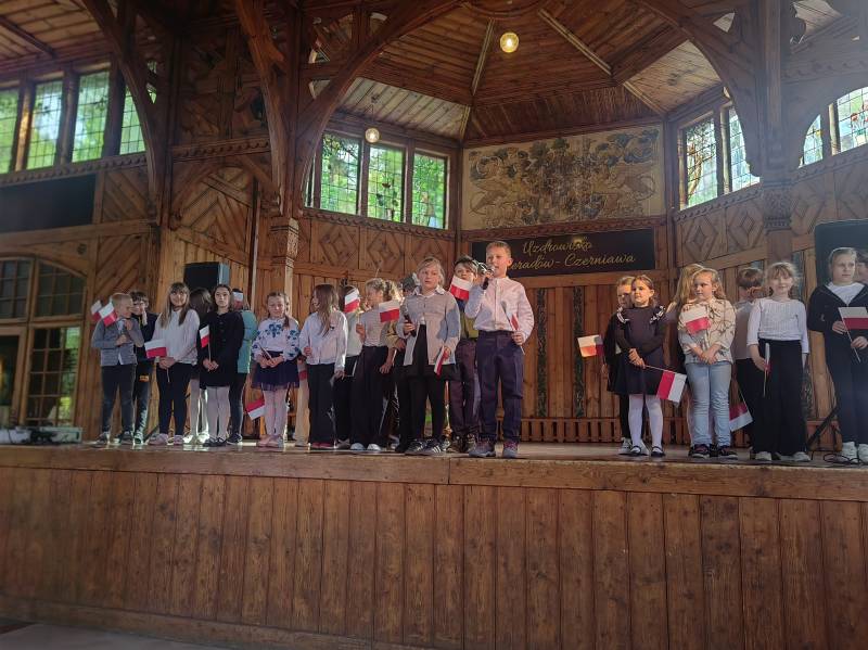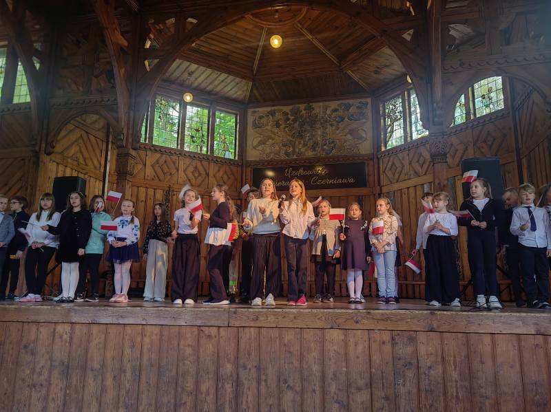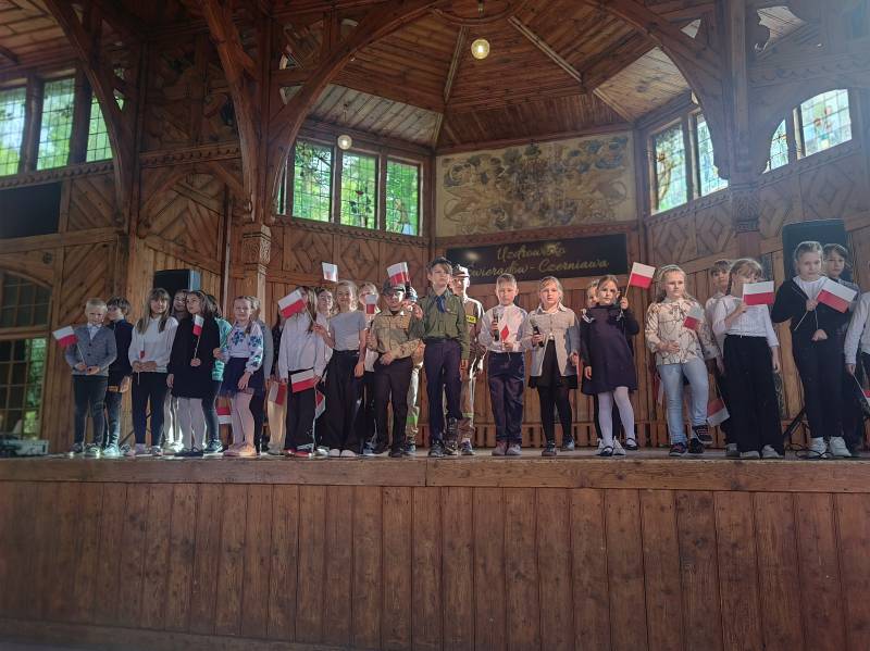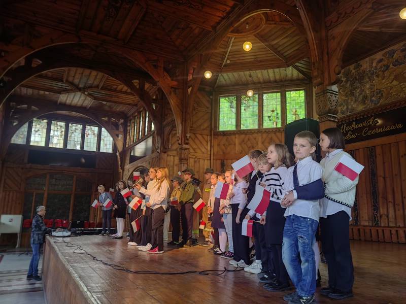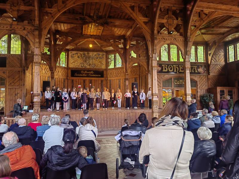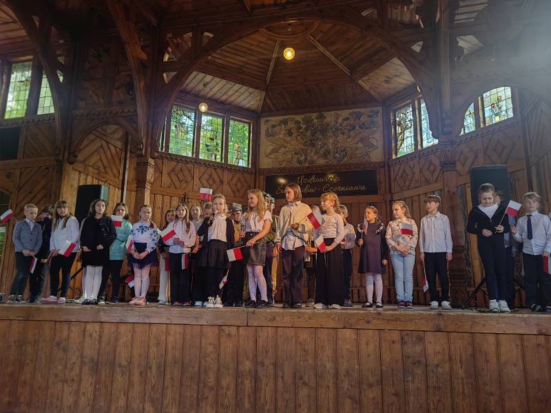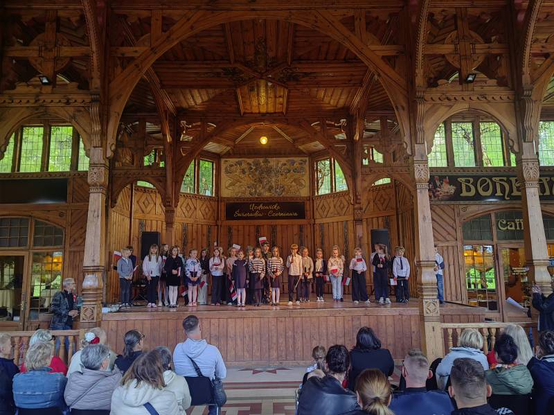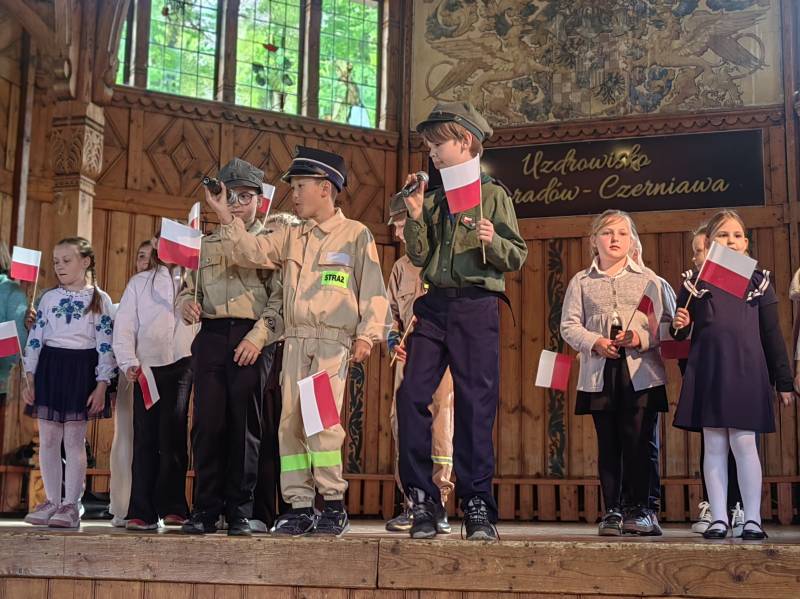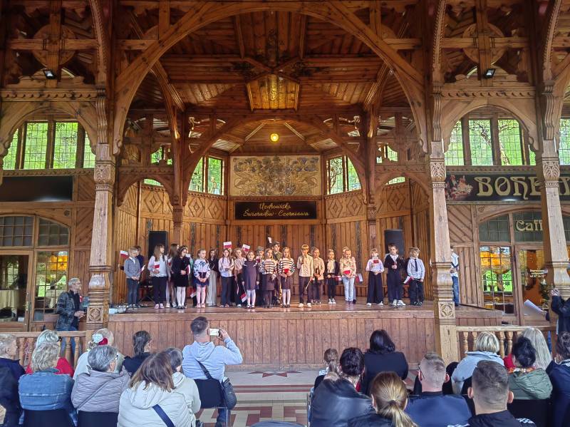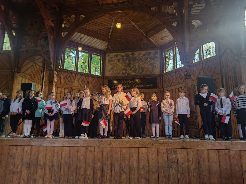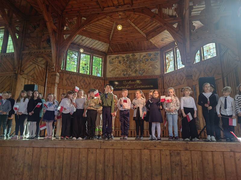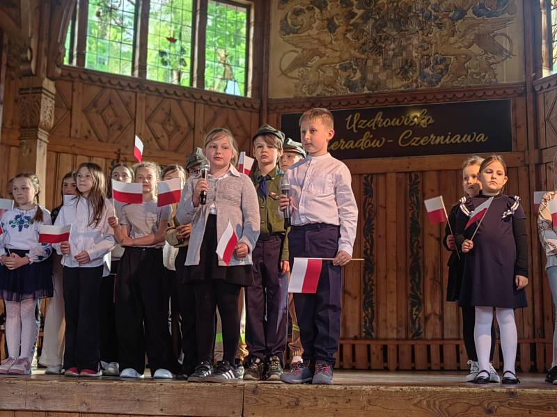 Na scenie zaprezentowały się dzieci z Miejskiego Zespołu Szkół w Świeradowie-Zdroju – klasy 2b, 3a oraz 3b, przygotowane z ogromnym zaangażowaniem przez panie: Izabelę Salawę, Ewę Mazur i Teresę Fierkowicz. Wystąpili uzdolnieni soliści, którzy wykonali patriotyczne utwory: „Rogatywka”, „Myśmy są wojsko” oraz „Jestem Polakiem”, a także recytatorzy, którzy wzbudzili podziw i wzruszenie wśród publiczności. Wojtek, Lena, Zuzanna, Łucja, Hania, Zuzia, Józef, Grzesiu, Tosia, Jagoda, Maria, Maja, Maciej, Kacper, Sei, Ignacy, Iga, Julia, Iga oraz Milana – Wasze interpretacje przypomniały nam, jak ważne jest pielęgnowanie pamięci i szacunku wobec historii – już od najmłodszych lat. Dzieci wystąpiły z ogromnym zaangażowaniem i wrażliwością – serdecznie dziękujemy wszystkim Rodzicom i Wychowawcom za ich piękne przygotowanie. Były niesamowite – mogą Państwo być z nich dumni!