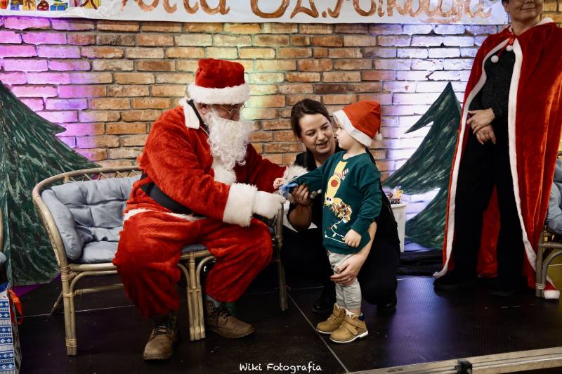 A potem przyszła ta najbardziej wyczekiwana chwila — spotkanie każdego dziecka z Mikołajem. Kilkadziesiąt maluchów, wraz z rodzicami i dziadkami, odebrało upominki, zrobiło pamiątkowe zdjęcia, a niektóre dzieci wręczyły Mikołajowi własnoręcznie przygotowane drobiazgi.