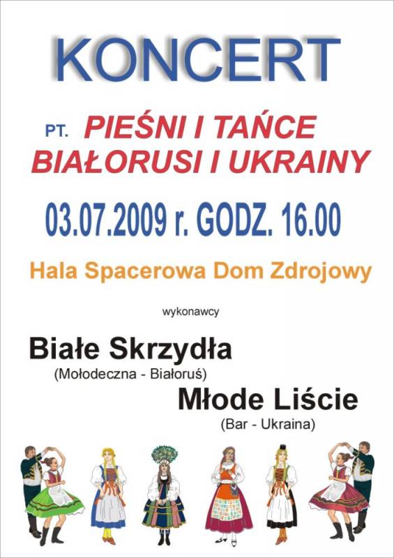 Zapraszamy Państwa na koncert pn. "Pieśni i tańce Białorusi i Ukrainy" w dniu 03.07.2009 r. o godz. 16.00 w Hali Spacerowej w Domu Zdrojowym.