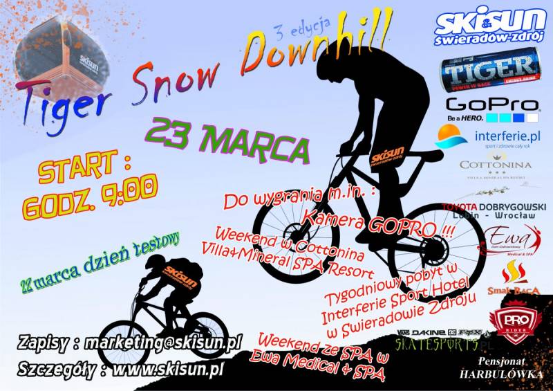 Zapraszamy do Ośrodka SKI&SUN (kolej gondolowa) Świeradów Zdrój na 3 edycję zawodów downhill w tym roku pod nazwą „Tiger Snow Downhill” już 23 marca.