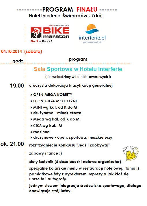 Gdy wszyscy zawodnicy dotrą do mety a słońce schowa się za górami wszyscy przeniosą się do Aqua Park Sport Hotel Interferie gdzie rozpocznie się Gala Finałowa Bike Maraton 2014.