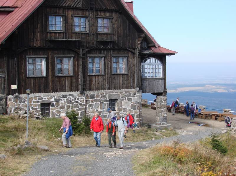 Der Anfang der Route befindet sich wieder beim Kurhaus (ul.3-go Maja). Wir nehmen die asphaltierte Straße in Richtung Berge. Nach dem ersten steilen Anstieg, an der Straßenkreuzung gelangen wir über den Roten Weg nach rechts. Wir gehen vorbei an den Pensionen „Czeszka” und „Słowaczka” und biegen nach rechts ab, anschließend nach links über den Pfad, eine Abkürzung in die Berge. Man kann ebenfalls über die asphaltierten Straßen gehen, die in Form von Serpentinen den Berg hinauf führen. Wir kommen nun bei der Heufuderbaude auf 1075m Höhe an. Man muss ab der Baude ca. 45min über den Grünen Weg gehen um dann bei der Tafelfichte (1124m) anzukommen, wo sich ein Grenzübergang für Tourisen befindet und außerdem noch weitere Attraktionen finden, wie z.B.ein Aussichtsturm, von wo aus man einen herrlichen Blick auf die tschechische Seite des Isergebirges genießen kann.