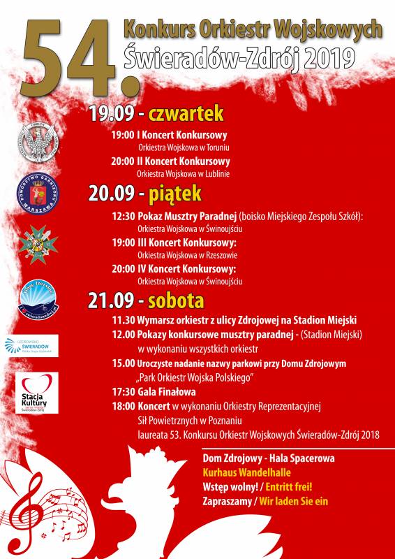 - godz. 18:00 - Hala Spacerowa - Koncert w wykonieniu Orkiestry Reprezentacyjnej Sił Powietrznych w Poznaniu - laureata 53. Konkursu Orkiestr Wojskowych Świeradów-Zdrój 2018