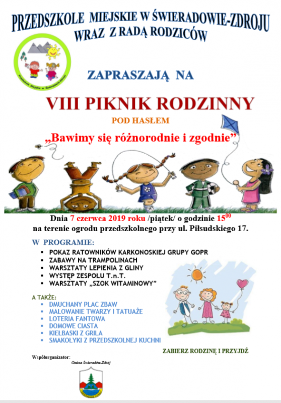 Przedszkole Miejskie w Świeradowie-Zdroju wraz z Radą Rodziców zapraszaja 7 czerwca o godzinie 15:00 na VIII Piknik Rodzinny pod hasłem " Bawimy się r.oznorodnie i zgodnie"