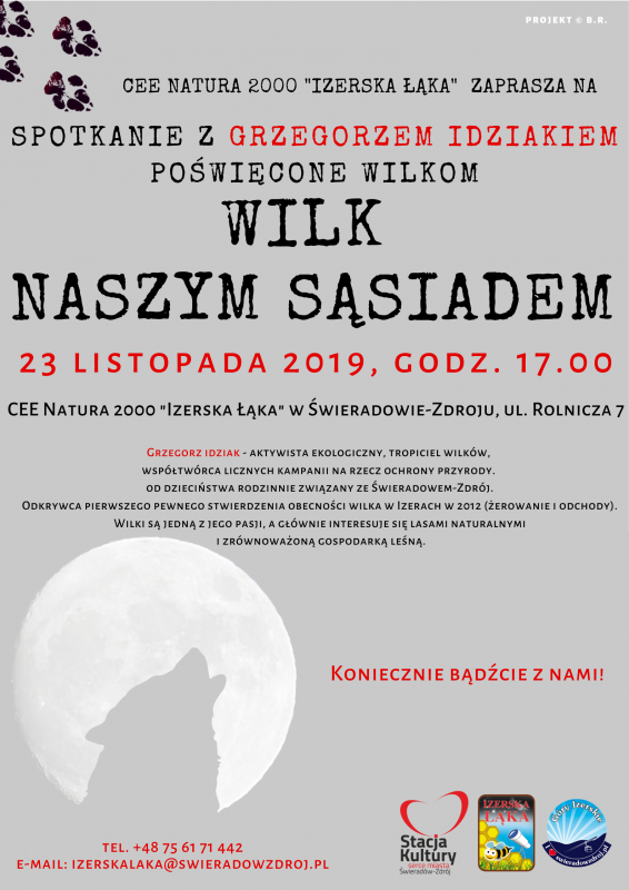 Wilki wróciły w Góry Izerskie co bardzo nas cieszy, jednocześnie martwi nas też strach mieszkańców przed tymi drapieżnikami. Chcielibyśmy na spotkaniu przedstawić jaśniejszą stronę tego zwierzęcia, jego sposób życia, aby łatwiej było nam te zwierzęta zrozumieć, a tym samym wiedzieć jak zachować się w terenie, na którym przebywają. Poinformujemy także jak przestrzegać zasad, aby uniknąć sytuacji, w której wilki oswajają się i zaczynają stwarzać problemy np. dla zwierząt domowych. Koniecznie bądźcie z nami!