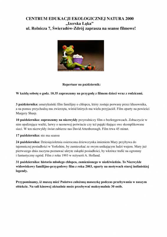 W każdą sobotę o godz. 10.35 zapraszamy na przygodę z filmem dzieci wraz z rodzicami.