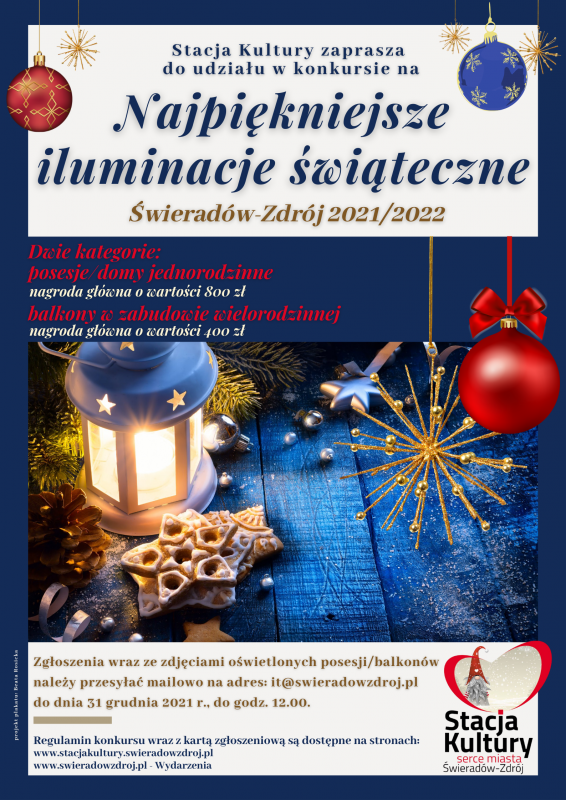 Wystartowała kolejna edycja konkursu na „Najpiękniejsze iluminacje świąteczne” w Świeradowie-Zdroju. W organizowanym przez Stację Kultury współzawodnictwie wyłonione zostaną najpiękniej oświetlona posesja prywatna oraz balkon w budownictwie wielomieszkaniowym.