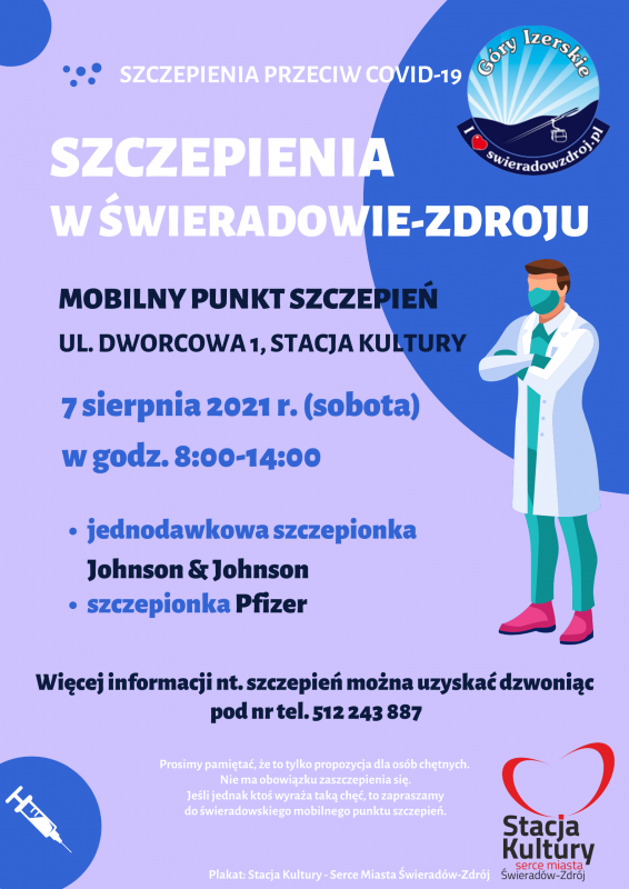 Już w sobotę, 7 sierpnia br. osoby chcące zaszczepić się przeciw COVID-19 ????będą mogły to zrobić w ????mobilnym punkcie szczepień w Stacji Kultury przy ul. Dworcowej 1.
