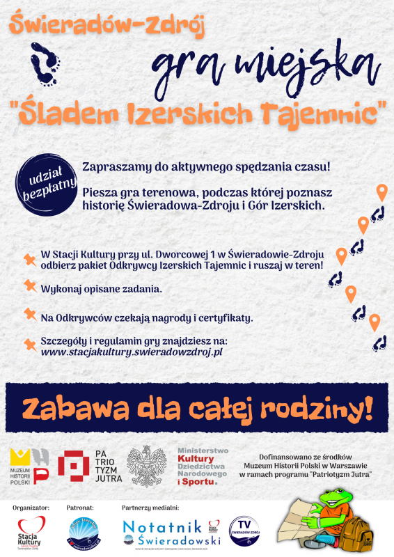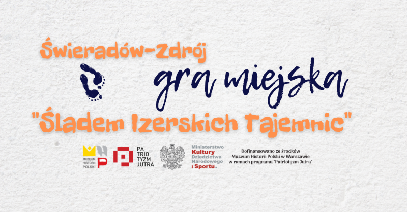 Realizacja projektu Miejskiego Centrum Kultury, Aktywności i Promocji Gminy "Stacja Kultury" w Świeradowie-Zdroju pn. Co tam w mieście gra? Gra miejska „Śladem Izerskich Tajemnic” jest możliwa dzięki dofinansowaniu ze środków Muzeum Historii Polski w Warszawie w ramach programu „Patriotyzm Jutra”. Wartość działania to 9 470,00 zł, w tym dofinansowanie 8 000,00 zł.