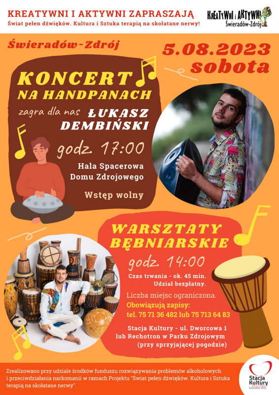 "Zrealizowano przy udziale środków funduszu rozwiązywania problemów alkoholowych i przeciwdziałania narkomanii" w ramach Projektu "Świat pełen dźwięków. Kultura i Sztuka terapią na skołatane nerwy".