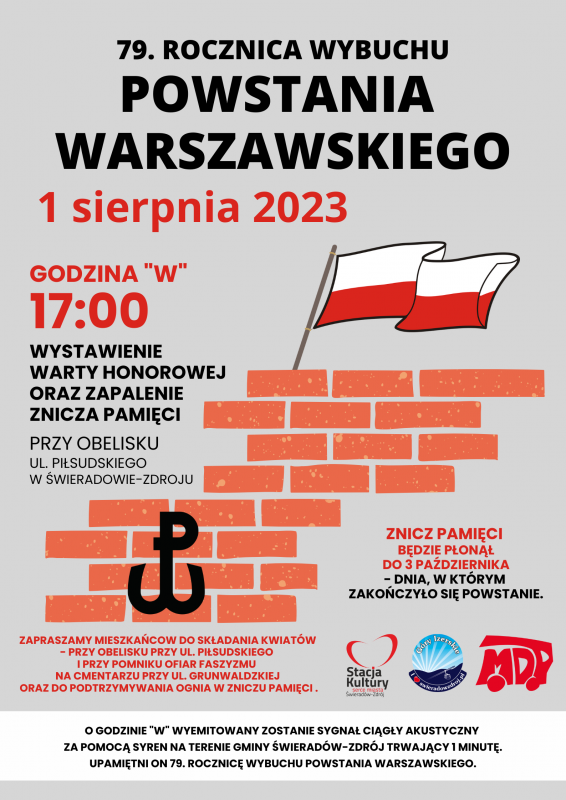 Zapraszamy do udziału w obchodach 79. rocznicy wybuchu Powstania Warszawskiego. 1 sierpnia 2023 o Godzinie "W" - 17:00 - wystawiona zostanie warta honorowa przy Obelisku (ul. Piłsudskiego). Zapalimy również Znicz Pamięci, który będzie płonął do 3 października - dnia, w którym zakończyło się Powstanie. Zapraszamy Mieszkańców do składania kwiatów - przy Obelisku przy ul. Piłsudskiego i przy Pomniku Ofiar Faszyzmu na cmentarzu przy ul. Grunwaldzkiej oraz do podtrzymywania ognia w Zniczu Pamięci. O Godzinie "W" wyemitowany zostanie sygnał ciągły akustyczny za pomocą syren na terenie gminy Świeradów-Zdrój trwający 1 minutę. Upamiętni on 79. rocznicę wybuchu Powstania Warszawskiego.