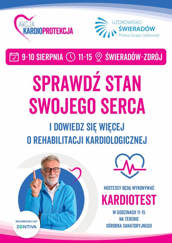 W dniach 9-10 sierpnia seniorzy spędzający czas w Uzdrowisku w Świeradowie-Zdroju będą mieli możliwość skorzystania z bezpłatnego badania swojego stanu zdrowia za pomocą KardioTestu oraz otrzymają informacje jak dbać o serce. Wydarzenie jest dostępne dla wszystkich zainteresowanych. Zachęcamy do skorzystania z tej okazji i poszerzenia wiedzy dotyczącej profilaktyki chorób sercowo-naczyniowych!