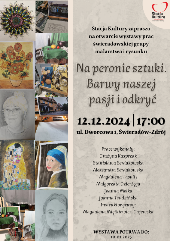 Wernisaż odbędzie się w czwartek, 12 grudnia 2024 r. o godz. 17:00 w sali wystawienniczej Stacji Kultury, przy ul. Dworcowej 1 w Świeradowie-Zdroju.