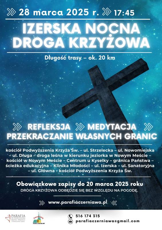 Zapisanie się na listę uczestników jest obowiązkowe. Termin zapisów upływa 20.03.2025. Zapisać się można na trzy sposoby: *osobiście w parafii, *telefonicznie (516 174 315), *mailowo (parafiaczerniawa@gmail.com). Osoby niepełnoletnie tylko z osobą dorosłą.