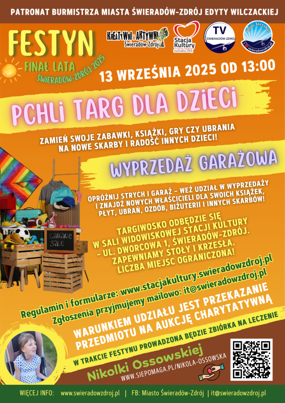 - Pchli Targ dla Dzieci – zamień swoje zabawki, książki, gry czy ubrania na nowe skarby i radość innych dzieci! oraz Wyprzedaży Garażowej – opróżnij strych lub garaż i znajdź nowych właścicieli dla swoich książek, płyt, ubrań, ozdób, biżuterii i innych skarbów! (regulamin i karta zgłoszenia poniżej)