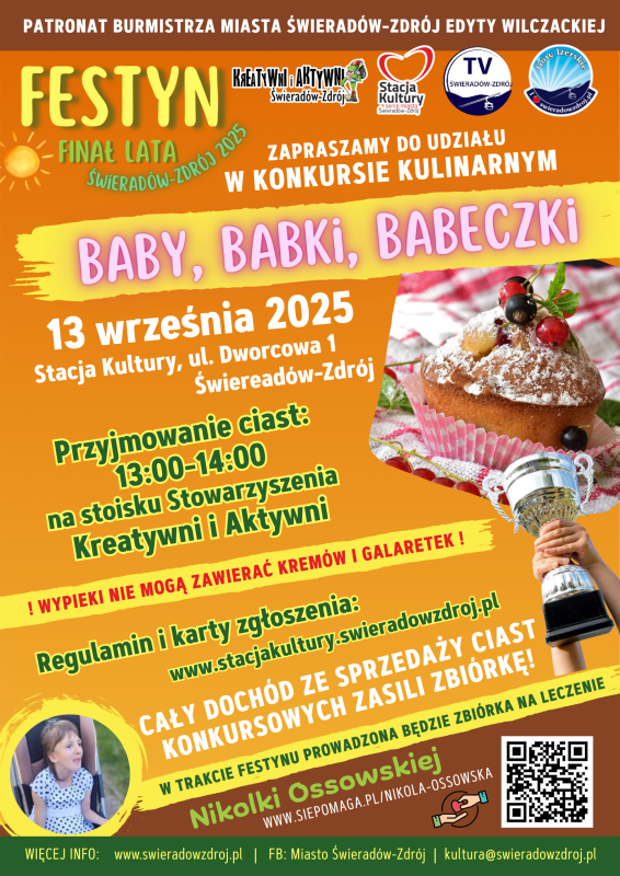 - Konkurs kulinarny „Baby, Babki, Babeczki” - przyjmowanie ciast: 13:00–14:00 na stoisku Stowarzyszenia Kreatywni i Aktywni, WAŻNE: Wypieki nie mogą zawierać kremów i galaretek! (regulamin i karty zgłoszenia poniżej)