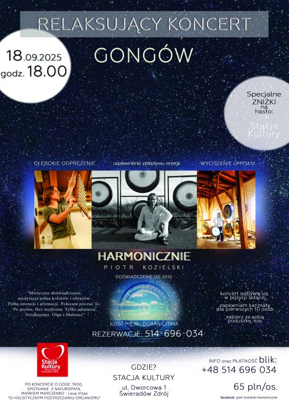 Zapraszamy na wyjątkowy koncert gongów w wykonaniu Piotra Kozielskiego – Harmonicznie, który od 2010 roku prowadzi dźwiękowe podróże w głąb siebie.