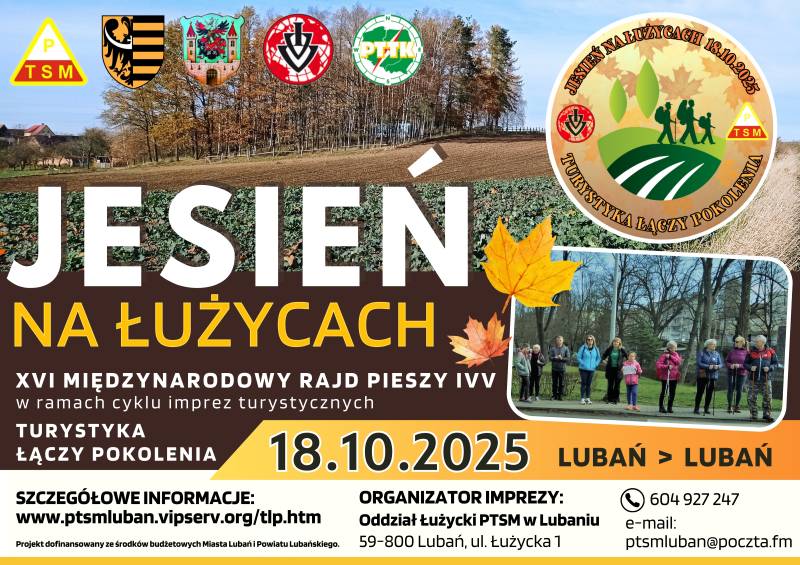 Oddział Łużycki Polskiego Towarzystwa Schronisk Młodzieżowych w Lubaniu, Międzyszkolne Koło PTSM „Piast” w Lubaniu, Osiedlowe Koło PTTK nr 35 w Lubaniu, Starostwo Powiatowe w Lubaniu, Urząd Miasta Lubań i Polska Federacja Popularyzacji Turystyki w Szczecinie organizują w dniu 18 października 2025 r. (sobota) XVI Rajd Pieszy na trasie o długości 10 km według zasad IVV pod nazwą „JESIEŃ NA ŁUŻYCACH” z cyklu imprez „Turystyka Łączy Pokolenia”.