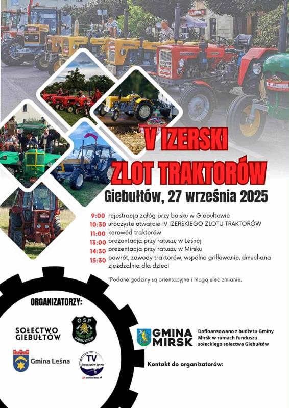 Już w sobotę, 27 września 2025 r. zapraszamy wszystkich miłośników maszyn rolniczych, dobrej zabawy i lokalnych tradycji na wyjątkowe wydarzenie – V Izerski Zlot Traktorów w Giebułtowie!